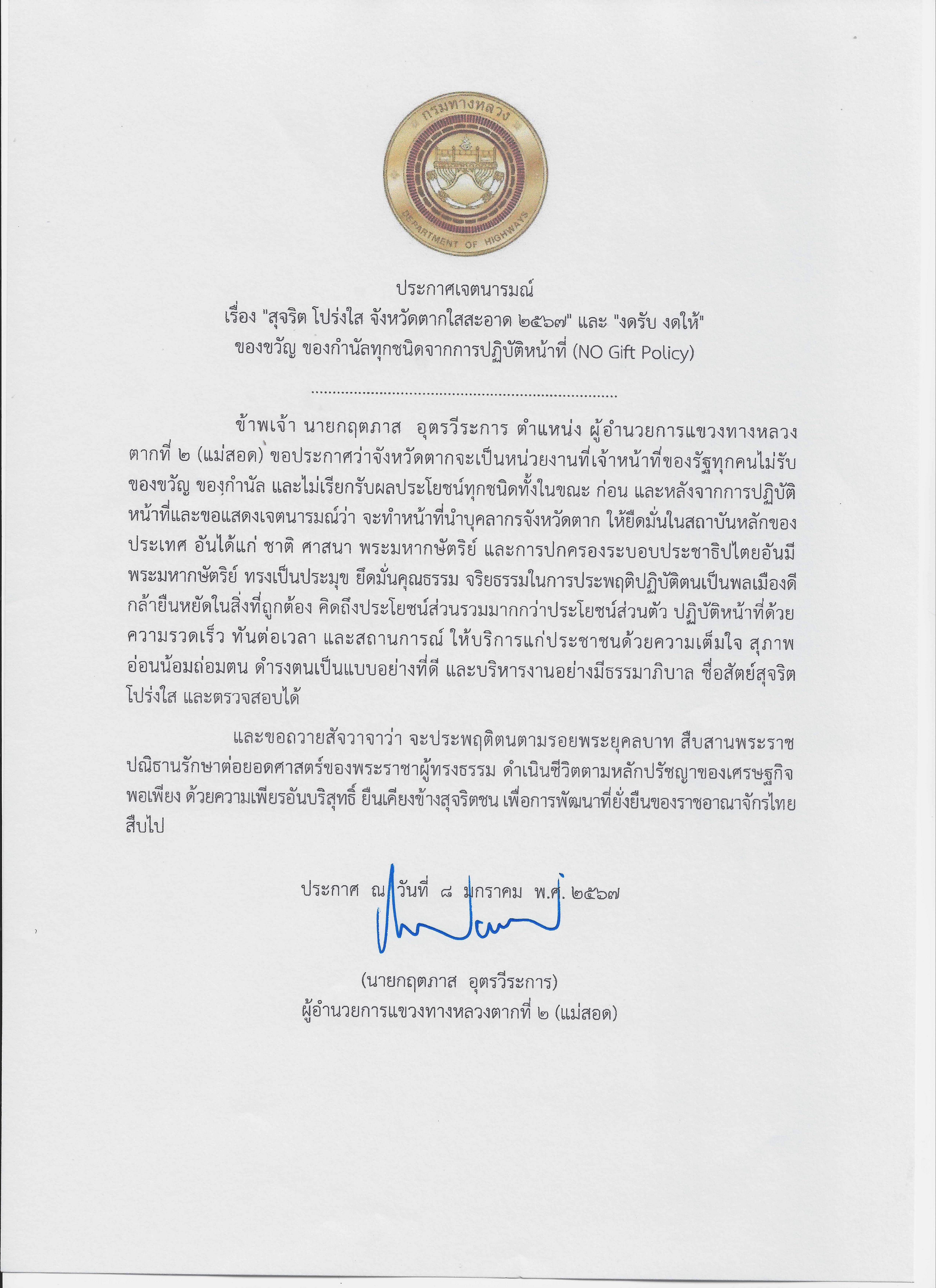 นายกฤตภาส อุตรวีระการ ผู้อำนวยการแขวงทางหลวงตากที่ 2 (แม่สอด) พร้อมด้วยข้าราชการและเจ้าหน้าที่ในสังกัดแขวงทางหลวงตากที่ 2 (แม่สอด) ประกาศเจตนารมณ์ "สุจริต โปร่งใส จังหวัดตากใสสะอาด 2567" ตามนโยบาย งดรับ งดให้ของขวัญ รวมถึงผลประโยชน์อื่นใดจากการปฏิบัติหน้าที่ ทุกเทศกาลและทุกโอกาส