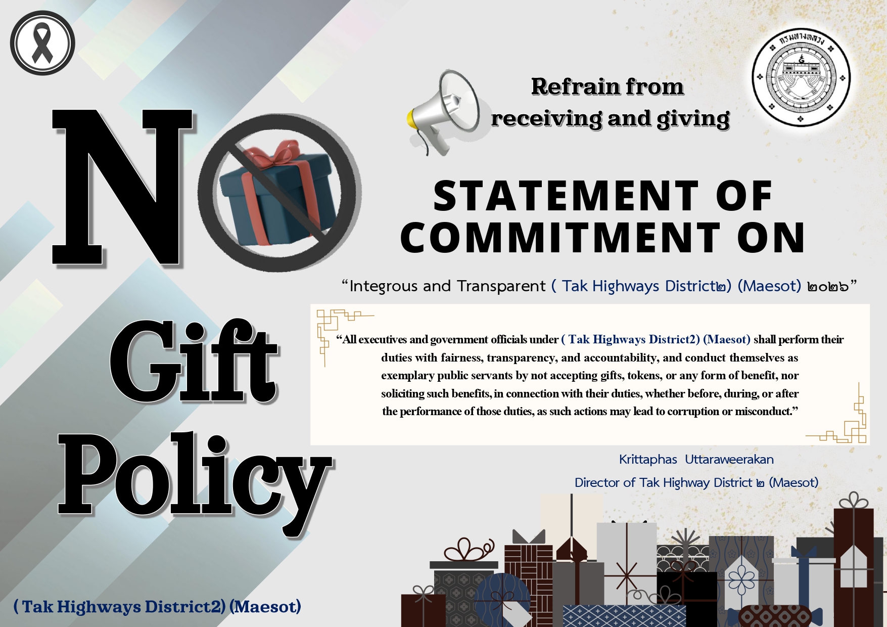 พร้อมด้วยข้าราชการและเจ้าหน้าที่ในสังกัดแขวงทางหลวงตากที่ 2 (แม่สอด) พร้อมใจปฏิบัติหน้าที่อย่างเป็นธรรม โปร่งใส ตรวจสอบได้และดำรงตนเป็นแบบอย่างที่ดี ไม่รับของขวัญ ของกำนัล และไม่เรียกรับผลประโยชน์ทุกชนิดจากการปฏิบัติหน้าที่ ทั้งในขณะ ก่อน และหลังการปฏิบัติหน้าที่ ที่จะส่งผลให้เกิดการทุจริตและประพฤติมิชอบ